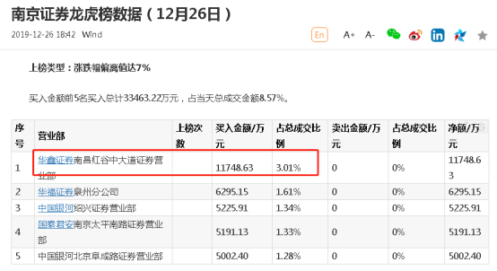 而据12月26日龙虎榜显示,顶级游资赵老哥席位惊现南京证券买入席位之中。据悉,赵老哥常用席位华鑫证券南昌红谷中大道以11748.63万元的买入额高居买方榜首,而其两个席位中国银河证券绍兴和中国银河证券北京阜成路双双上榜,分列买方第三位和第五位。