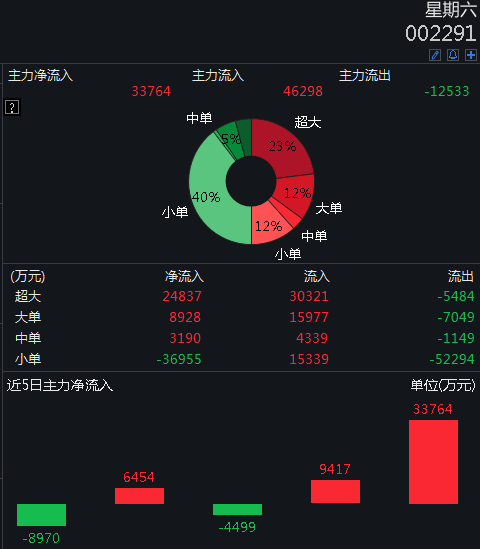 从主力资金流入的情况看,今日星期六场内资金流入量也在大幅攀升。数据显示,截至午盘,已有超3.3亿元主力资金流入,到达近五日主力流入量的最高峰。