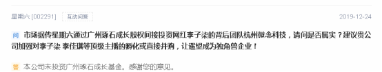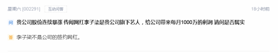 更有意思的是,市场还一度流出传言,星球六通过间接持股方式,拥有运营顶级流量艺人李子柒等明星,不少投资者也前往深交所互动易上进行询问,但目前这一说法暂时被公司否认。