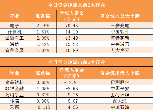 28个申万一级行业中,16个行业实现资金净流入,其中电子行业净流入79.43亿元居首。