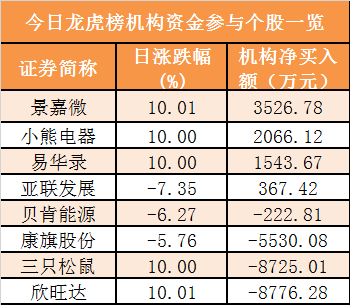盘后龙虎榜数据显示,机构现身8股,其中景嘉微等4股呈现机构资金净买入,欣旺达等4股呈现机构资金净卖出。