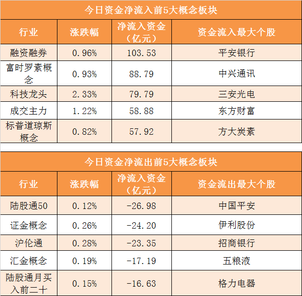概念板块方面,今日融资融券、富时罗素概念、科技龙头、成交主力等概念板块资金呈现净流入,其中融资融券概念净流入103.53亿元居首。