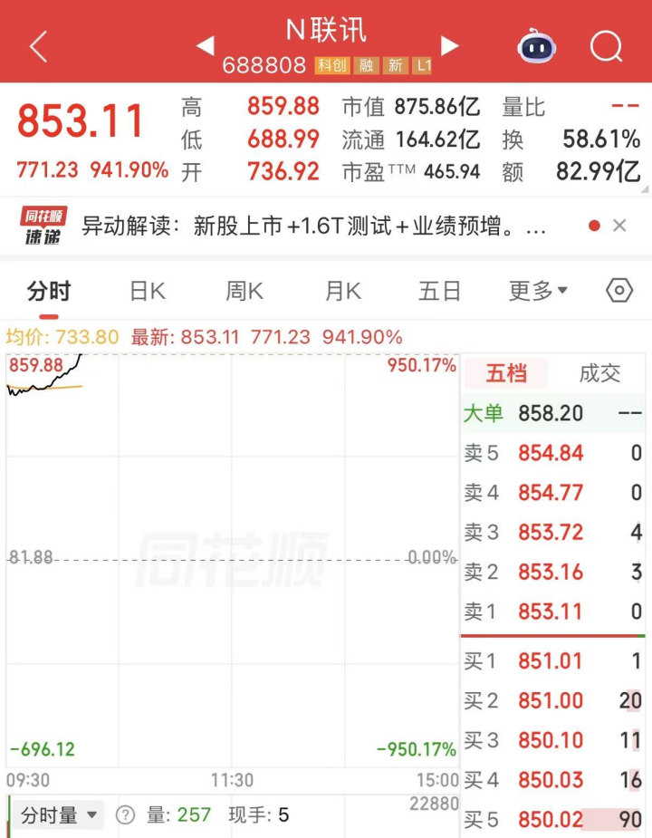 N联讯开盘价736.92元/股,上涨800.00%,早盘最高价为859.88元/股,最高涨幅为950.17%,成为年内首日涨幅最大的新股。以早盘最高价计算,中一签最高盈利超38.9万元,仅次于沐曦股份-U(上市当日最高赚39.5万元)。