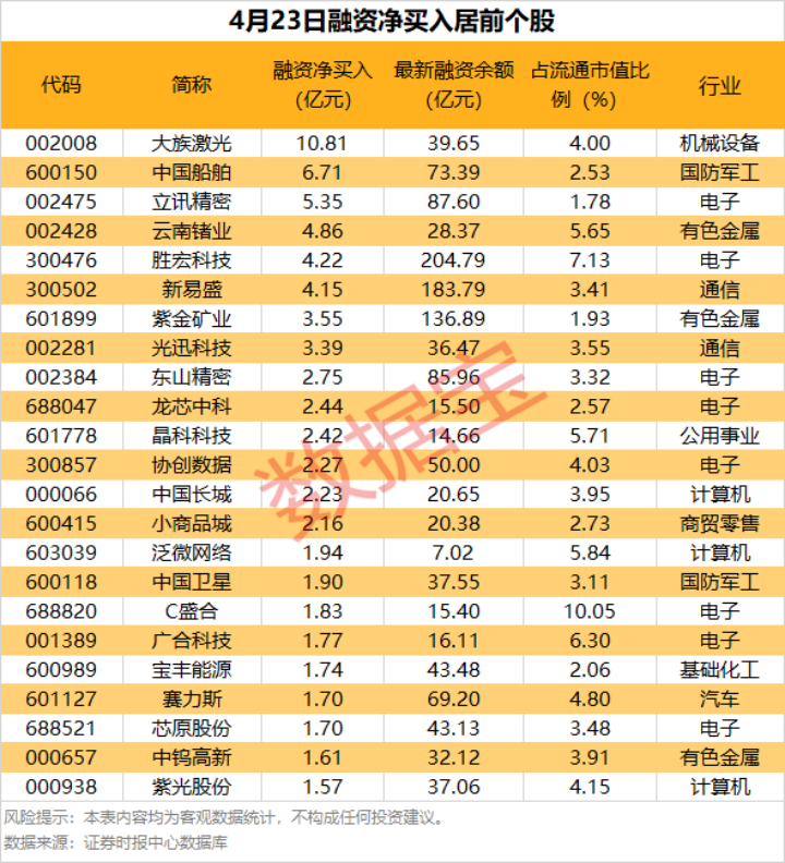 具体到个股,4月23日共有1764只股获融资净买入,净买入金额在1亿元以上的有44只,其中8只融资净买入额超3亿元。大族激光融资净买入额居首,当日净买入10.81亿元,其次是中国船舶、立讯精密,融资净买入金额分别为6.71亿元、5.35亿元,融资净买入金额居前的还有云南锗业、胜宏科技、新易盛等。