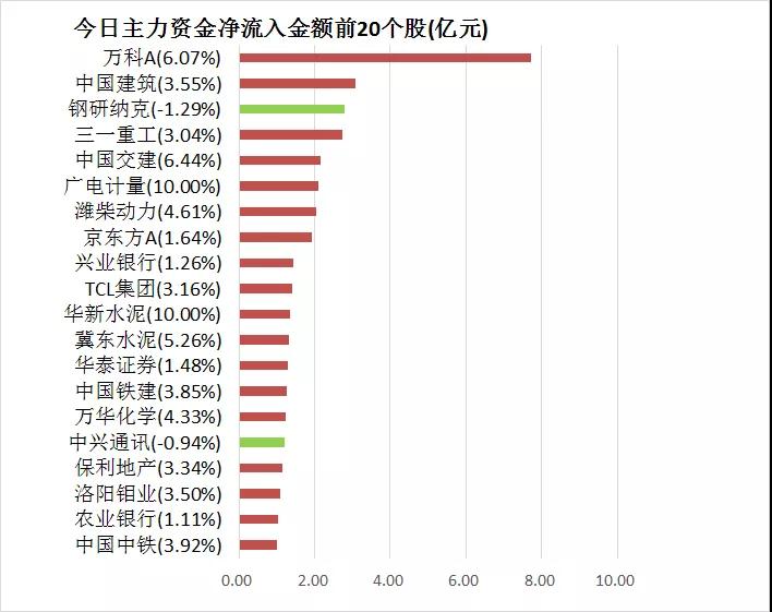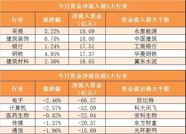 今日沪深两市主力资金开盘净流出65.96亿元,尾盘净流入3.96亿元,两市全天资金净流出107.18亿元。
