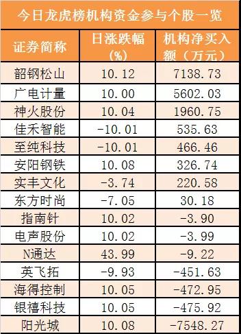 盘后龙虎榜数据显示,机构现身15股,其中韶钢松山等8股呈现机构资金净买入,阳光城等7股呈现机构资金净卖出。