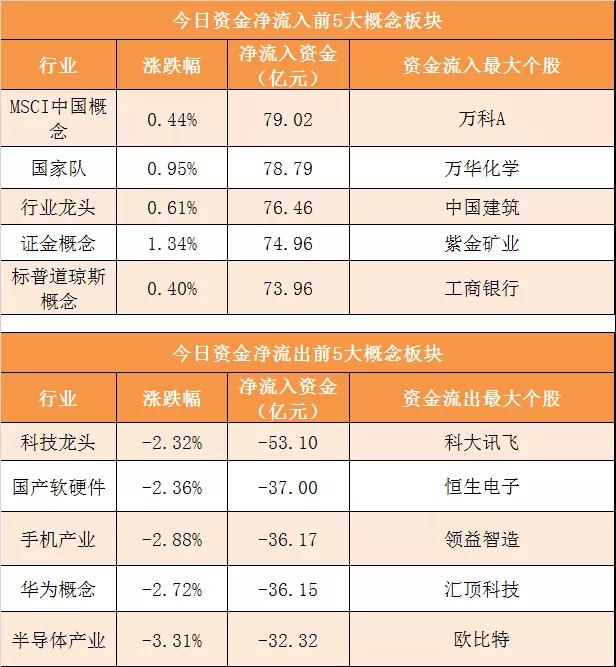 概念板块方面,今日MSCI中国概念、国家队、行业龙头、证金等概念板块资金呈现净流入,其中MSCI中国概念净流入79.02亿元居首。