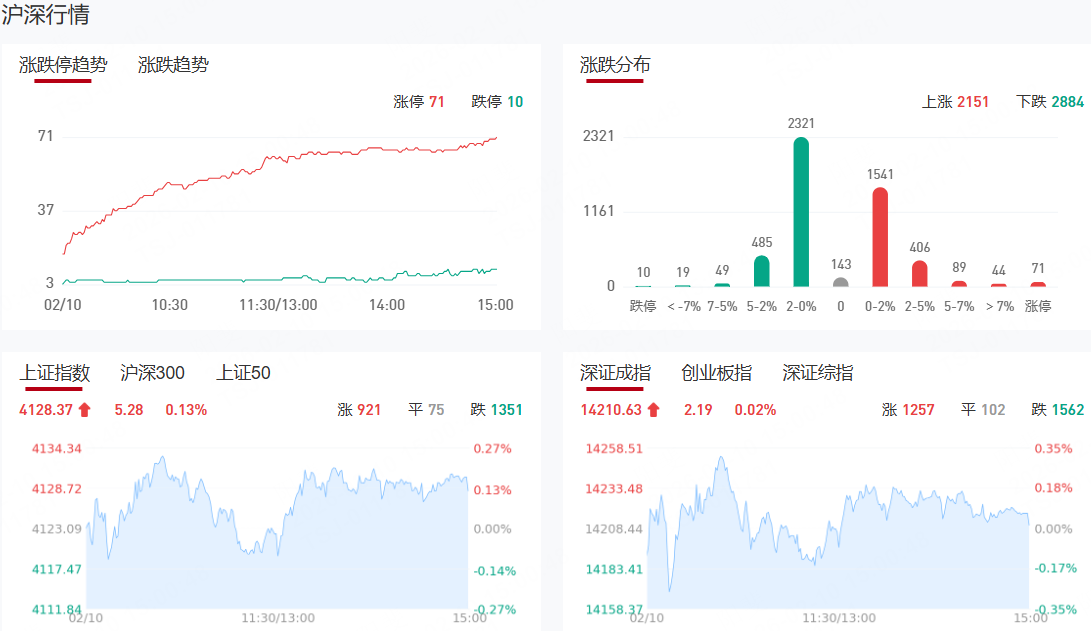 板块方面,文化传媒、文生视频、算力硬件等板块表现活跃,旅游零售、白酒、贵金属、煤炭、商业航天、光伏等板块表现落后。截至收盘,沪指涨0.13%,深成指涨0.02%,创业板指跌0.37%。