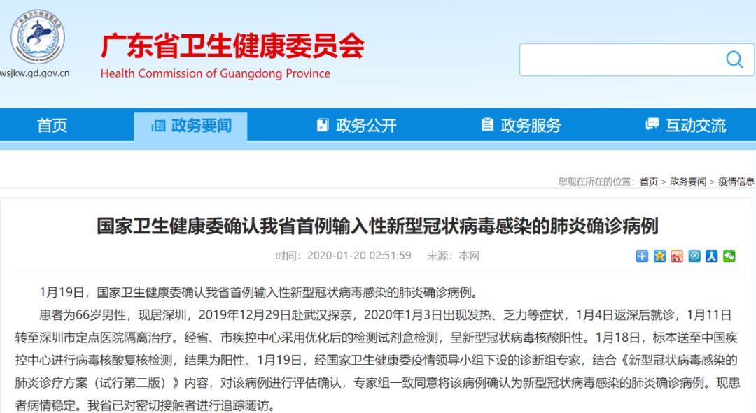 通告显示,患者为66岁男性,现居深圳,2019年12月29日赴武汉探亲,2020年1月3日出现发热、乏力等症状,1月4日返深后就诊,1月11日转至深圳市定点医院隔离治疗。经省、市疾控中心采用优化后的检测试剂盒检测,呈新型冠状病毒核酸阳性。1月18日,标本送至中国疾控中心进行病毒核酸复核检测,结果为阳性。1月19日,经国家卫生健康委疫情领导小组下设的诊断组专家,结合《新型冠状病毒感染的肺炎诊疗方案(试行第二版)》内容,对该病例进行评估确认,专家组一致同意将该病例确认为新型冠状病毒感染的肺炎确诊病例。现患者病情稳定。我省已对密切接触者进行追踪随访。