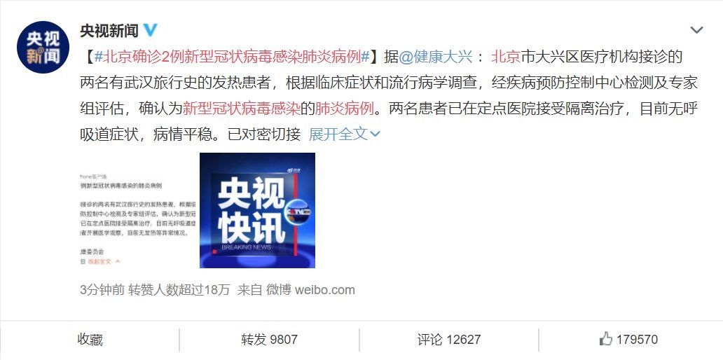据新华社报道,北京市大兴区医疗机构接诊的两名有武汉旅行史的发热患者,根据临床症状和流行病学调查,经疾病预防控制中心检测及专家组评估,确认为新型冠状病毒感染的肺炎病例。两名患者已在定点医院接受隔离治疗,目前无呼吸道症状,病情平稳。已对密切接触者开展医学观察,目前无发热等异常情况。