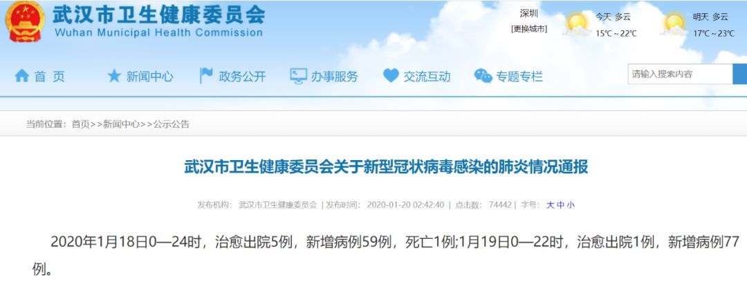 据武汉市卫生健康委员会1月20日通报,2020年1月18日0—24时,新型冠状病毒感染的肺炎患者治愈出院5例,新增病例59例,死亡1例;1月19日0—22时,治愈出院1例,新增病例77例。