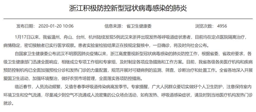此外,浙江卫健委官网20日通告,1月17日以来,浙江省温州、舟山、台州、杭州陆续发现5例武汉来浙并出现发热等呼吸道症状患者,目前均在定点医院隔离治疗,病情稳定,密切接触者已实行医学观察。患者实验室检验结果正在按规定复核中,一旦确诊,将及时向社会公布。