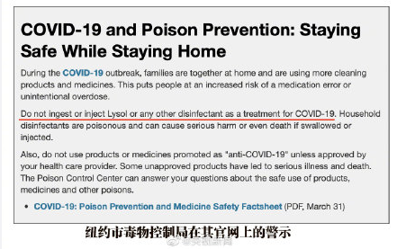 另外,纽约市毒物控制局在18小时内接到30通求助电话,其中9例关于消毒剂,10例关于漂白剂,11例为其他家用清洁剂。去年同一窗口期,该中心仅接到13例电话,无一例与消毒剂相关。