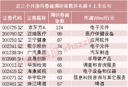 上述850家A股上市公司中,近3个月接待券商调研数量最多的是京东方A,累计接待券商达124家,根据Wind行业分类,公司属于电子元件行业;迈瑞医疗、卫宁健康接待券商调研数量分别居第二、三位,其近3个月接待调研券商分别达到95家、87家,前者属于医疗保健设备行业,后者属于应用软件行业,但其产品主要应用于医疗健康领域。