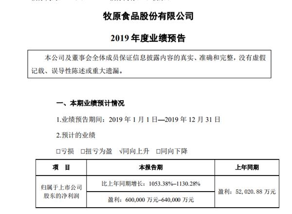同猪价一同“飞天”的,自然还有行业龙头的业绩。1月14日晚间,牧原股份(002714)公告预计公司2019年全年将实现净利润60亿元至64亿元,同比增长达1053.38%–1130.28%。