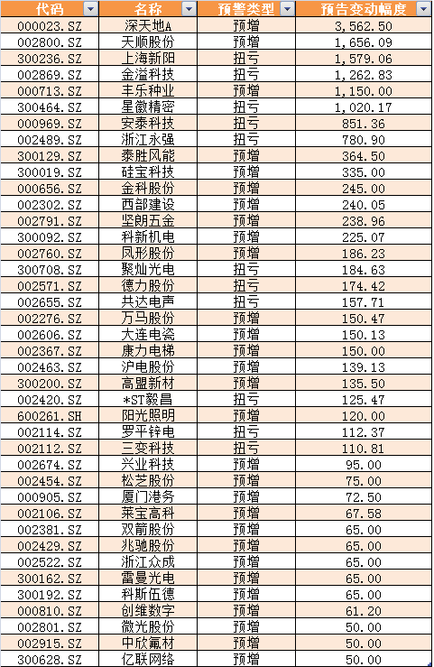 以预告的净利润变动上下限平均值测算,开尔新材、民和股份、宁波富邦、联化科技、深天地A、益 生股份等14家公司净利润预计同比增幅超过10倍。另外增幅超过300%的公司也高达29家,增幅在1倍到3倍之间的公司更是 达到110家。