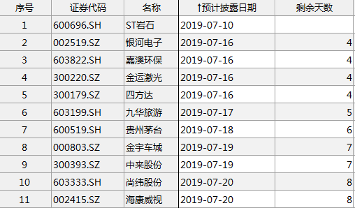中报业绩预告浪袭来,数据显示,本周公布业绩预告的公司的家数分别为20家,49家,64家,97家和109家,呈逐渐上升趋势,除了抢头筹的ST岩石已披露中报外,下周将有银河电子、四方达、嘉澳环保、金运激光、九华旅游、贵州茅台、中来 股份、金宇车城、海康威视、尚纬股份10家公司公布中报。