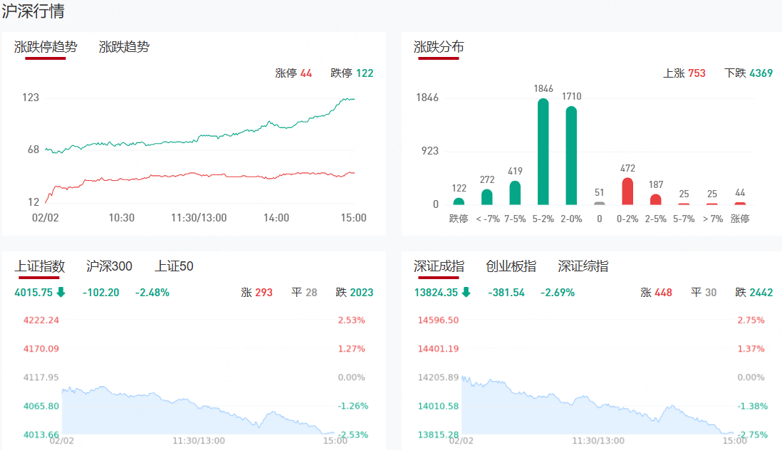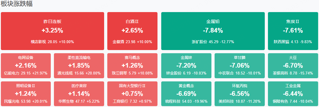 市场全天震荡调整,三大指数均跌超2%,科创50指数跌超3%。沪深两市成交额2.58万亿,较上一个交易日缩量2508亿。盘面上,全市场超4600只个股下跌,其中123只个股跌停。从板块来看,白酒概念反复活跃,皇台酒业3连板,金徽酒3天2板,水井坊触及涨停。电网设备概念逆势走强,汉缆股份、白云电器、三变科技、保变电气等多股涨停。下跌方面,有色金属、油气、化工、煤炭、半导体等板块跌幅居前。其中有色金属板块遭重挫,四川黄金、赤峰黄金、铜陵有色、西部矿业等多股跌停。存储芯片概念大跌,兆易创新、开普云跌停。