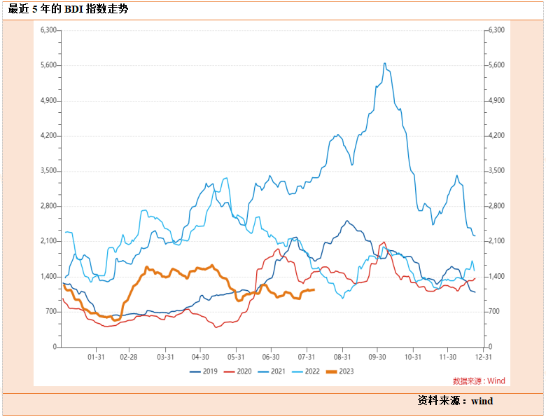 下半年,预计国际干散货运输市场在传统旺季三季度出现阶段性反弹,四季度逐渐回撤,总体表现将弱于2022年下半年,预计2023年全年BDI均值约为1350点。