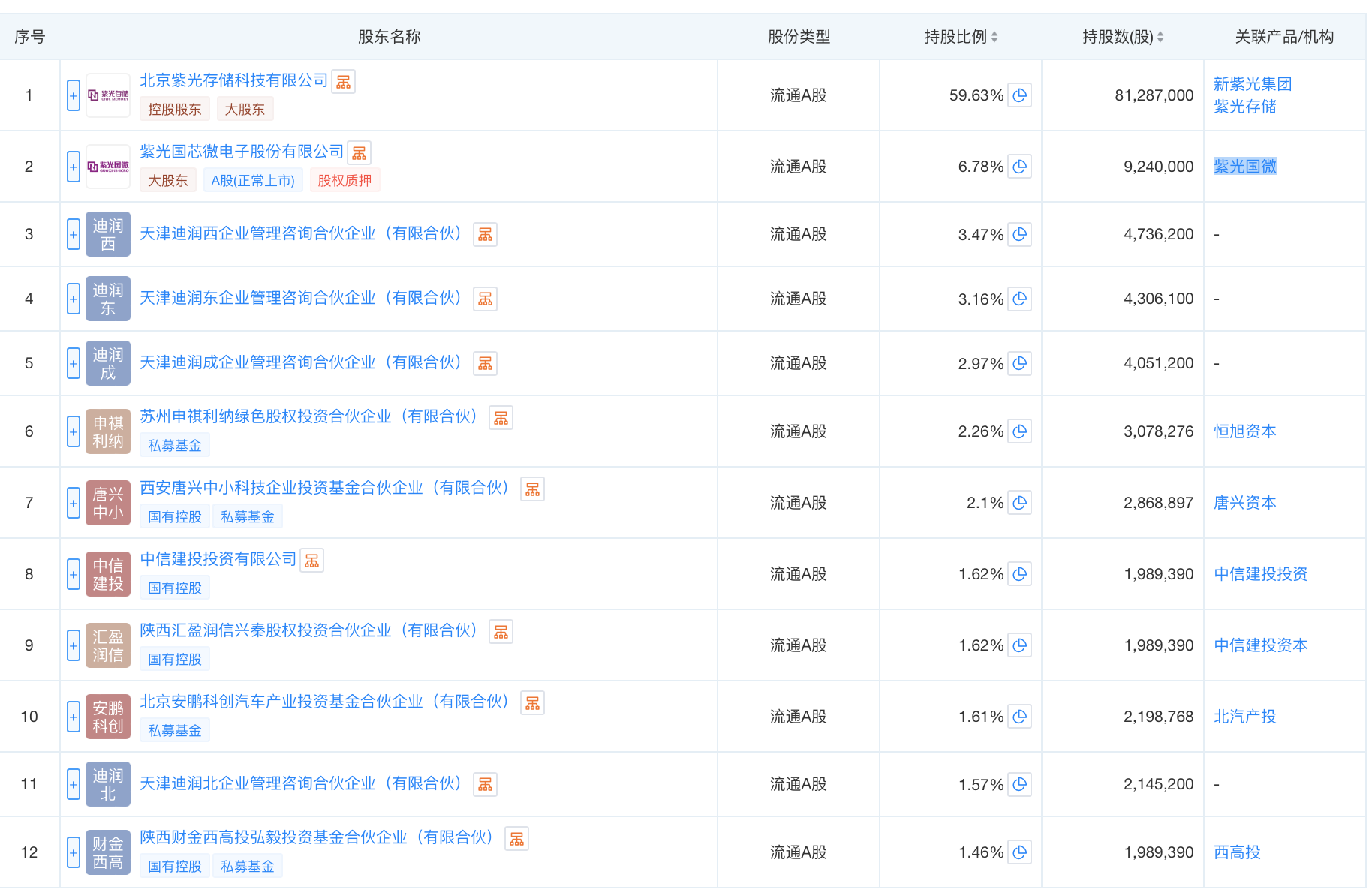 股权结构方面,北京紫光存储科技有限公司持有公司8128.70万股股份,持股比例为59.63%,为公司控股股东。上市公司紫光国微为其第二大股东,持股比例6.78%。紫光国芯前十大股东名单中,唐兴资本、中信建投投资、中信建投资本、西高投均为国有资本。