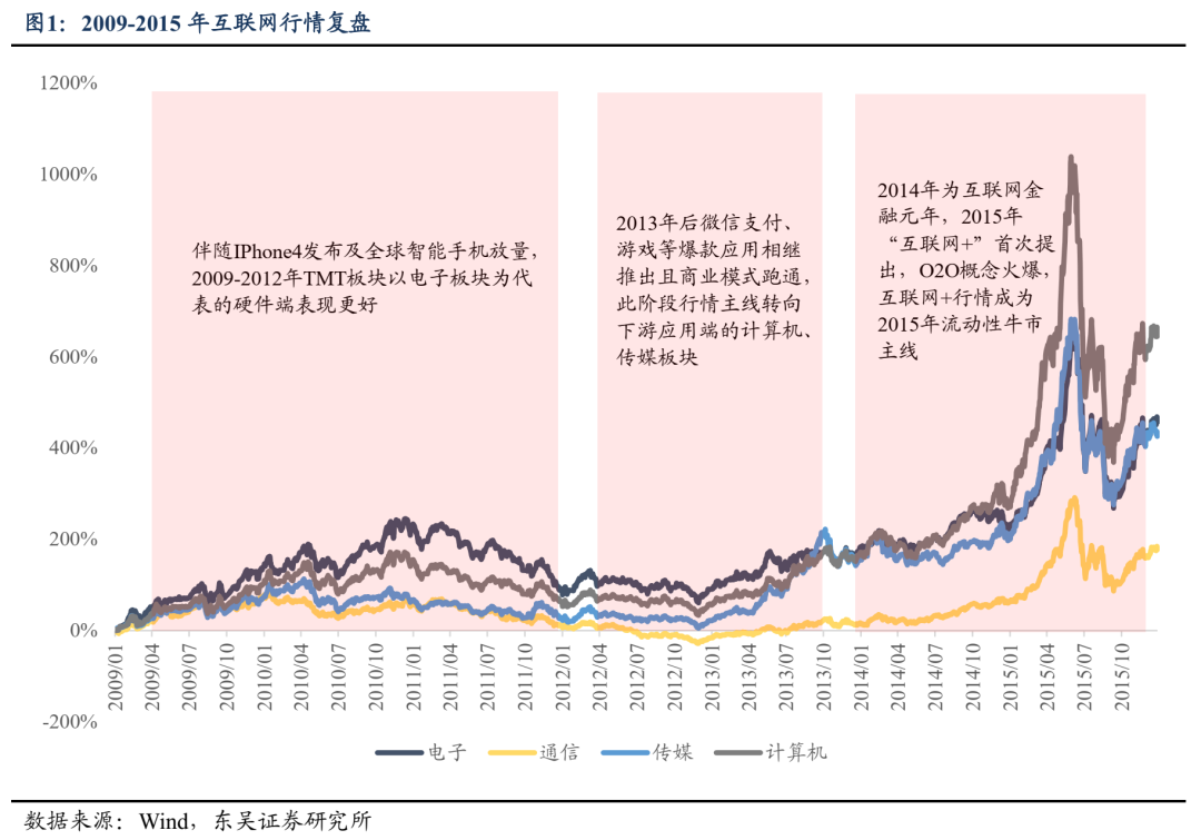 时间维度看,上游硬件主线行情为2009/06-2010/12的围绕果链供应链的消费电子行情,持续时间在1.5年左右,后续服务器方向在13-15年虽跟涨应用,但主要以点状行情为主,而下游应用端行情在2013年1月启动后,直到2015年6月才出现见顶,历时达两年半。空间维度看,2009/1/5-2015/6/12移动互联网行情始末,TMT板块中计算机、传媒板块向上弹性更大,累计涨幅分别为1039%和710%,高于硬件端电子、通信板块697%与300%的涨幅。