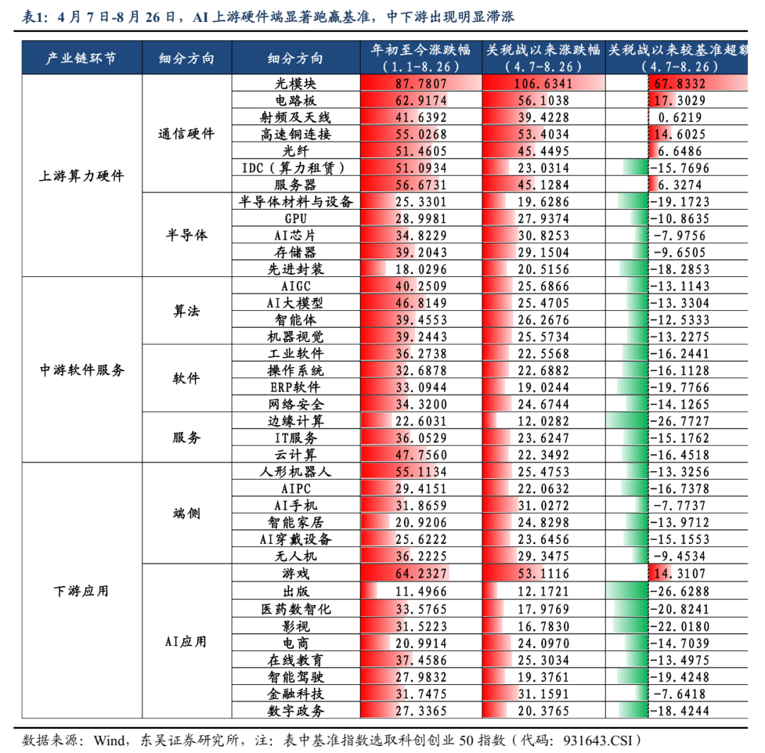 目前AI行情中,下游应用端相比上游硬件明显落后,为具备赔率优势的潜在配置方向。启动只是时间问题自4.7关税风波下大盘形成“黄金坑”以来,若以科创创业50作为基准,则仅有上游硬件端跑赢,消费电子、机器人板块次之,软件应用板块涨幅最为落后。从4月7日-8月26日区间涨跌幅来看,上游硬件端光模块/PCB/高速铜连接/服务器板块分别跑赢基准67.8/17.3/14.6/6.3pct,中下游软件及应用端仅游戏板块跑赢基准14.3pct,其余AIGC/智能体/云计算/人形机器人/AI穿戴设备/智能驾驶/电商等板块分别跑输基准13.1/12.5/16.5/13.3 /15.1/19.4/14.7pct。