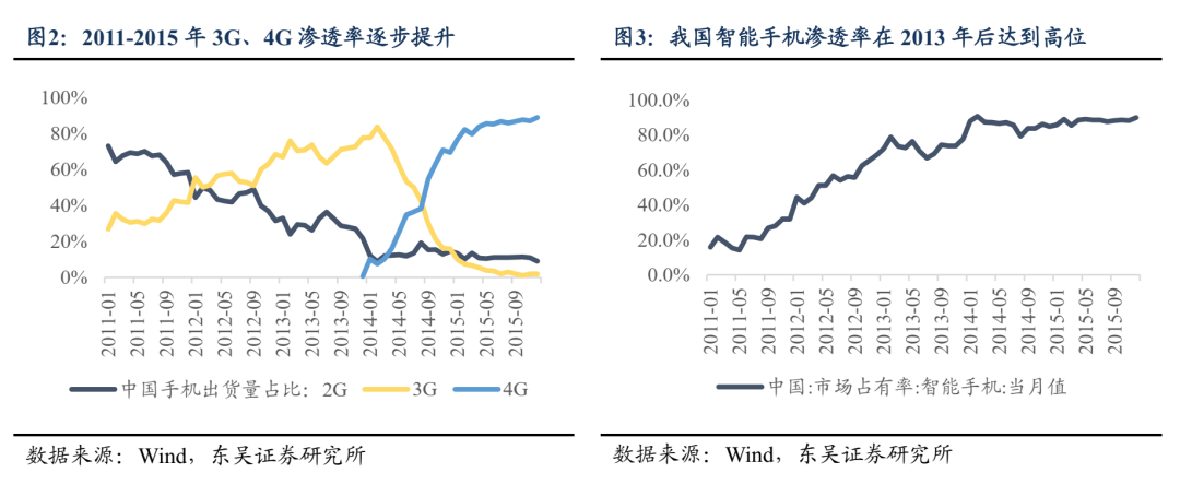 2013年以来,伴随4G的加速降费以及智能手机渗透率达到高位,移动互联网行情延伸至下游,2013年微信推出支付功能,《我是MT》开创的“免费游戏+内购道具”模式打通手游变现堵点,移动支付、手游等爆款应用的用户数在这一阶段实现激增,推动行情从上游硬件切换到以传媒、计算机为代表的下游应用端。2015年3月政府工作报告首提“互联网+”概念,同年7月国务院印发《关于积极推进“互联网+”行动的指导意见》,顶层设计推动下游应用场景持续拓展。“互联网+”概念向服务业、中游制造持续渗透,充分扩展行情宽度,叠加2015年流动性牛市助推,“互联网+”成为当时市场的绝对主线。此外,应用侧的“卖铲人”服务器逐步跑赢智能手机成为这一阶段的硬件端领涨主线。