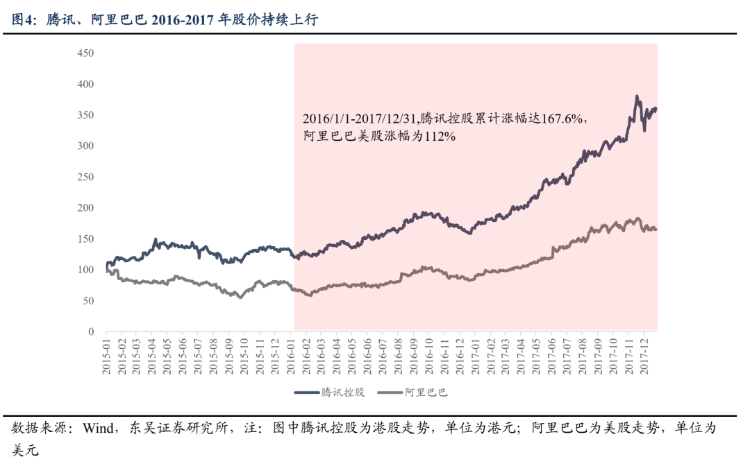2016-2017年则明显以结构性行情为主,一方面互联网流量初期红利出现消退迹象,根据中国互联网络信息中心数据,2016、2017年我国网民互联网普及率分别为53.2%与55.8%,相较2010-2015年的规模增长斜率有所放缓,移动互联逐步转向存量市场,头部厂商通过资金、技术、用户资源等优势持续扩大市场份额,中小厂商生存空间显著压缩;另一方面,2015年6月“水牛”行情见顶后,出现一段较大幅度的估值回归,市场风险偏好明显下行,对公司业绩兑现能力要求提高,在马太效应极为显著的互联网领域,龙头厂商的业绩能见度更高,2016-2017年腾讯、阿里营收利润实现高增,股价相应持续上行,2016/1/1-2017/12/31,港股腾讯/美股阿里巴巴涨幅分别为167%/112%。