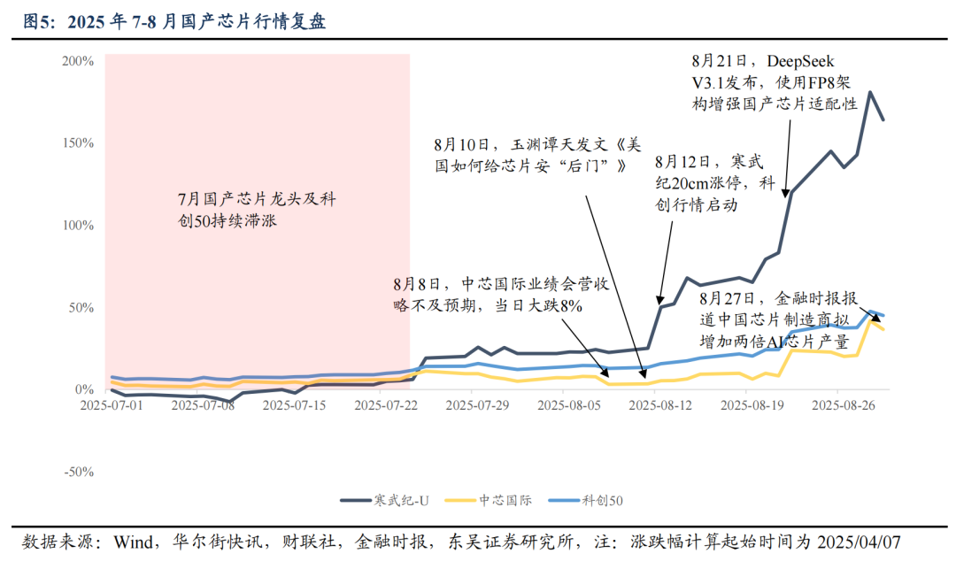 8月21日,DeepSeek V3.1使用FP8参数架构增强国产芯片适配性,8月27日金融时报报道中国芯片制造商明年拟将三倍扩张AI处理器产量,多头的叙事不断累积强化板块信心,科创50爆发出极大的上涨弹性:8月1日-27日科创50上涨超20%,显著跑赢沪深300与创业板指,寒武纪作为国产芯片龙头在此期间涨幅超90%。