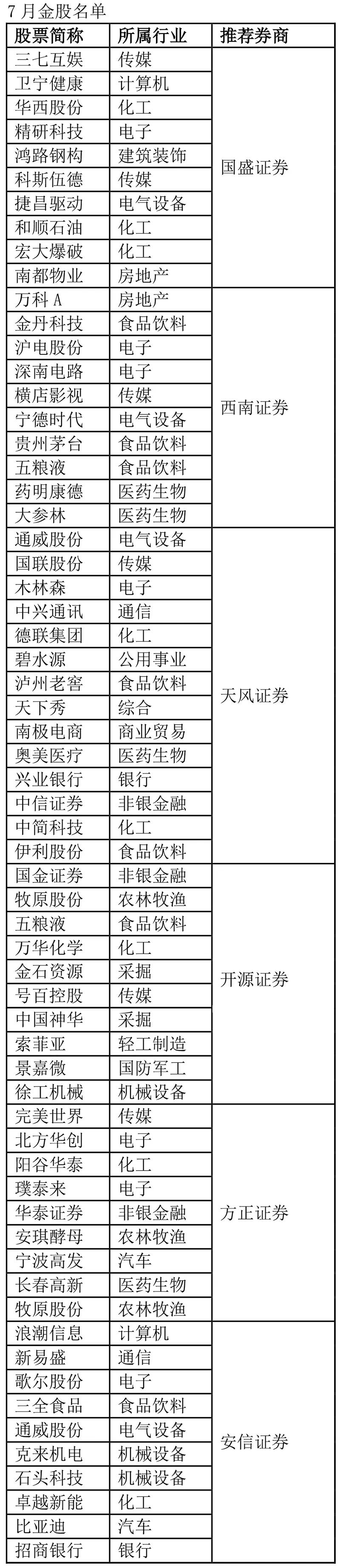多数券商认为下半年风格将会开启阶段性切换,7月金股组合相较6月有较大调整,加配了科技与低估值标的。