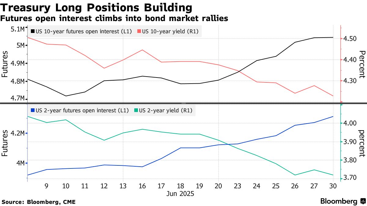 这种现象也反映在美国国债期货市场中。根据芝加哥商品交易所(CME)的未平仓合约数据显示,在最近这波债市上涨行情中,交易员持续加仓多头头寸,推动收益率持续下行。在10年期美债期货合约中,未平仓合约数量大幅攀升,同时10年期美债收益率也从4.4%以上回落至周二的低点4.185%。在2年期国债期货中,未平仓头寸已连续10个交易日上升。