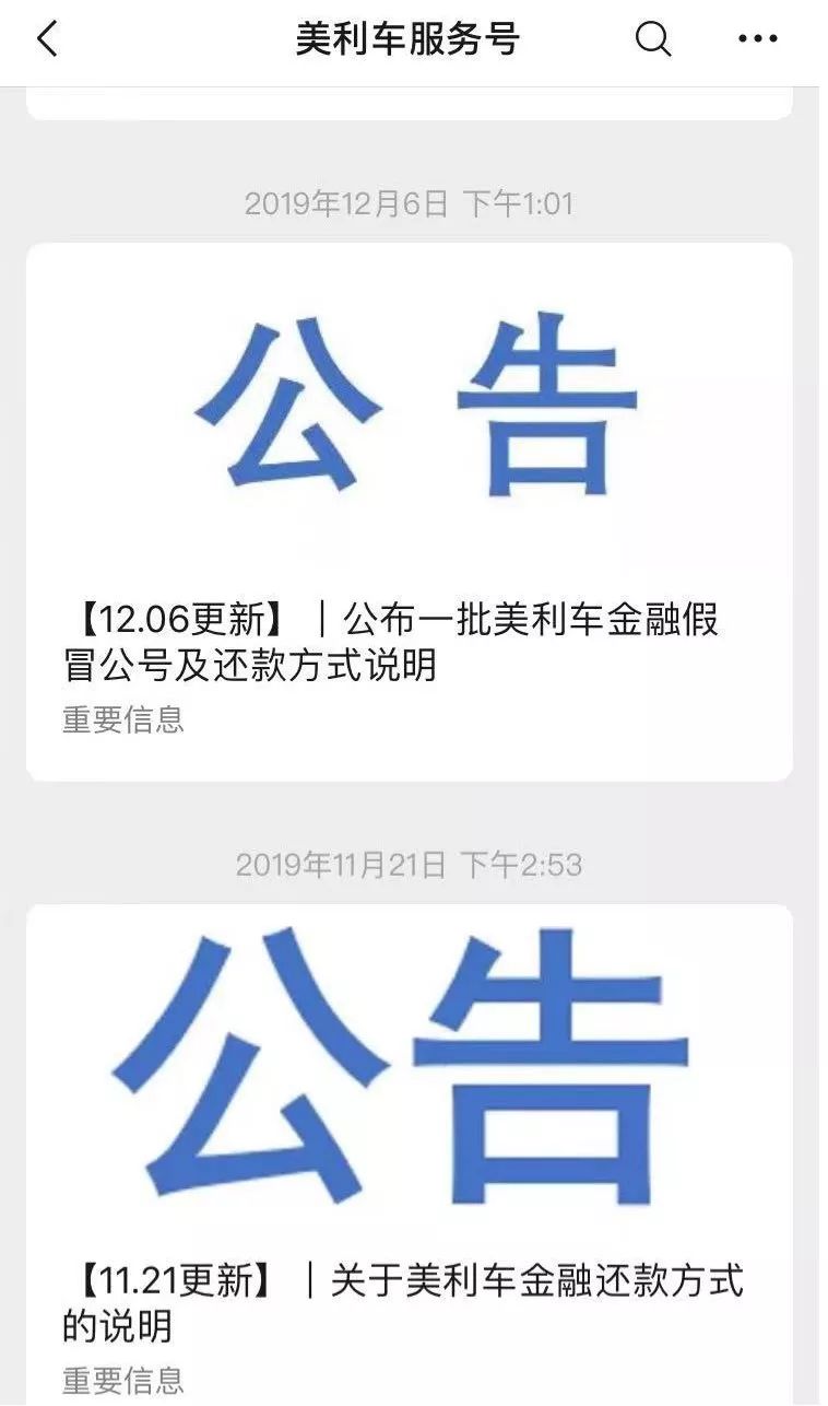 事实上,在11月11日警方大规模带走美利车金融高层和员工之后,用户开始出现拒绝还款的情况。从11月15日开始,这一情况越演越烈,美利车唯一的官方客服电话4008009200已经无法接通。在美利车金融的微信服务号”美利车服务号“上,不到一个时间已经连续公告三次,号召用户积极还款。