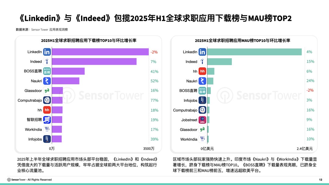 区域市场头部玩家强势快速上升。《BOSS直聘》下载量表现亮眼,已跻身2025年上半年全球下载榜前三和MAU榜前五,更是跃居收入榜亚军,增速远超欧美平台。《智联招聘》同样增长突出,入围全球下载榜第8名。