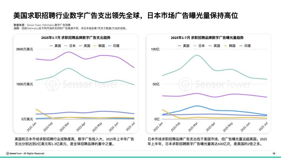 美国和日本市场求职招聘行业成熟度高,数字广告投入大,2025年上半年广告支出分别达到2亿美元和1.3亿美元,是全球招聘品牌的重中之重。