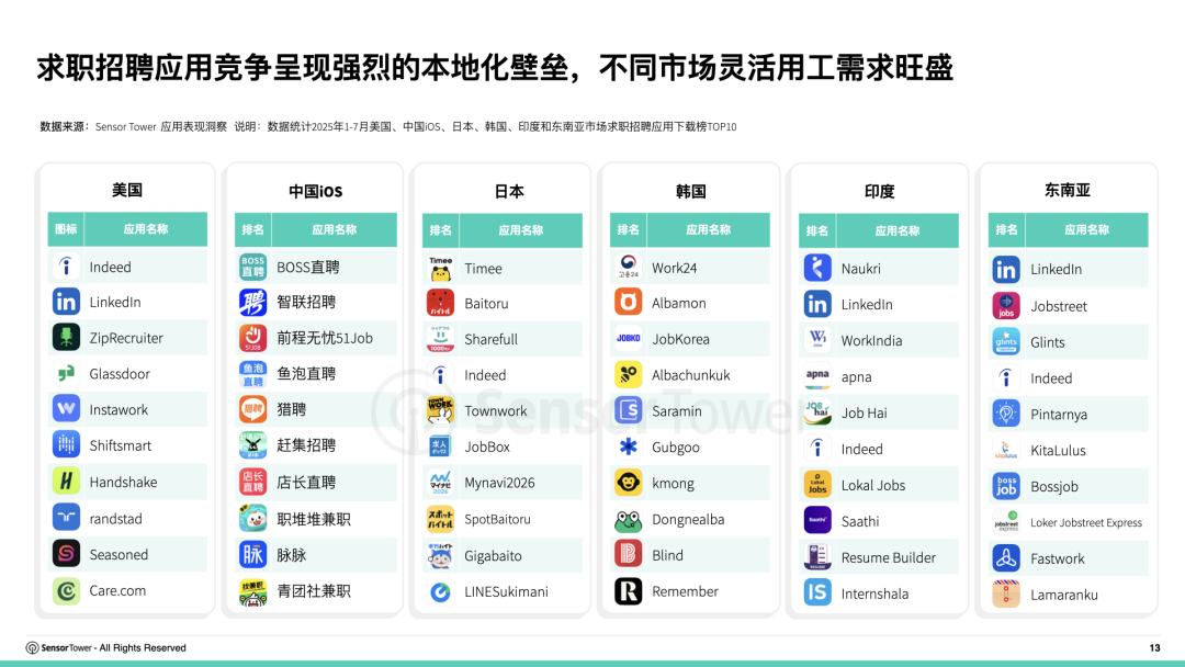 求职招聘应用竞争呈现强烈的本地化壁垒,不同市场灵活用工需求旺盛