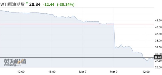油价上周五(3月6日)下挫10%后,3月9日再暴挫逾20%,布兰特及美国WTI油价分别跌至约35美元及32美元水平。