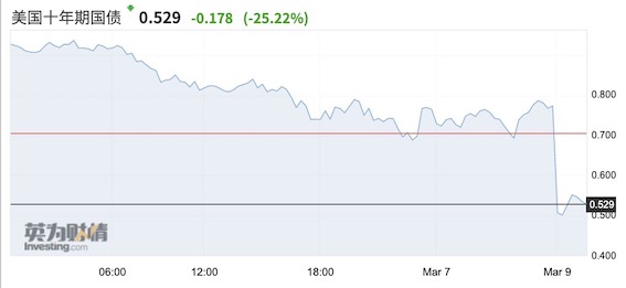两周前,美股经历了史诗级的单周暴跌,跌幅超出10%。但上周,跌势并未因美联储降息而止步。避险资金涌入美债市场,3月9日,美国10年期国债收益率一度跌破0.5%。市场已预期美联储下周再降息50个基点(bp)。