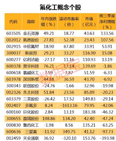 氟化工板块包括上游的萤石矿开采、氟化盐生产、下游制冷剂等多种个股。