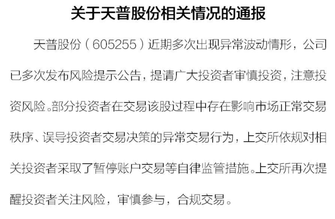 9月18日晚间,上交所发布情况通报称,天普股份(605255)近期多次出现异常波动情形,公司已多次发布风险提示公告,提请广大投资者审慎投资,注意投资风险。部分投资者在交易该股过程中存在影响市场正常交易秩序、误导投资者交易决策的异常交易行为,上交所依规对相关投资者采取了暂停账户交易等自律监管措施。上交所再次提醒投资者关注风险,审慎参与,合规交易。