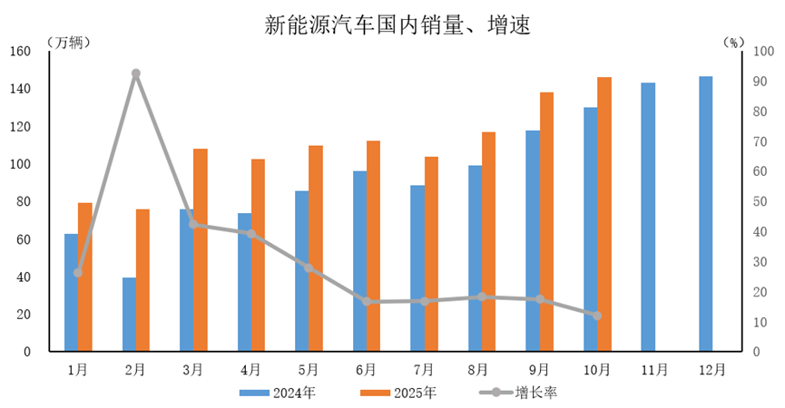 2025年1-10月,新能源汽车国内销量1092.9万辆,同比增长25.7%。