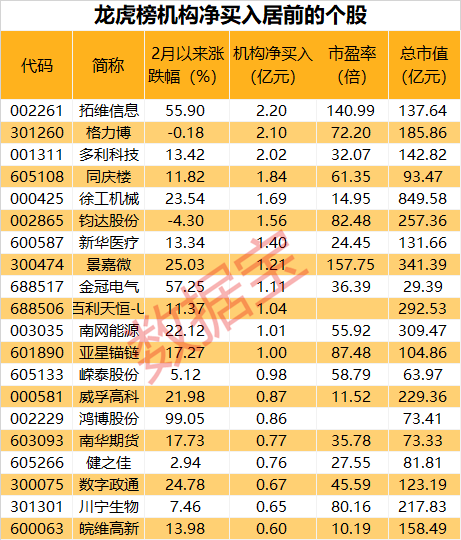 根据交易所披露的龙虎榜数据,证券时报·数据宝统计,2月以来,共有132股获机构专用席位净买入,其中11股净买入金额超亿元,包括拓维信息、格力博、多利科技等。