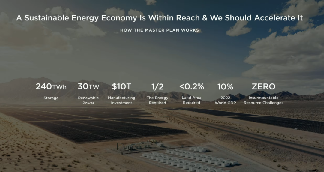 特斯拉公司在当地时间3月1日举办2023年投资者日活动。马斯克演示其提出全球走向完全可再生能源的“宏图计划”,储能240 TWH,可再生电力30 TWH,制造投资10万亿美元,能源要求不到燃料经济的一半。