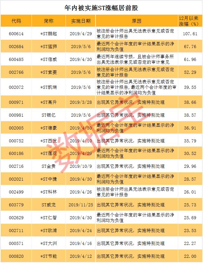 排名第二的是*ST猛狮,涨幅为67.76%,它是今年 5月6日被实施ST的,它的原因是最近两个会计年度的审计结果显示的净利润均为负值。排名第三是*ST信威,涨幅为61.96%。(数据宝 谢伊岚)