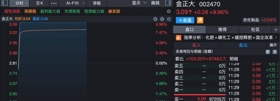 农林牧渔概念早间全线上攻,农用化工方向领涨,板块指数低开高走一度涨近4%,苏利股份高开后秒速涨停,金正大仅约2分钟由跌近3%垂直拉至涨停,赤天化、安道麦A等亦强势涨停。