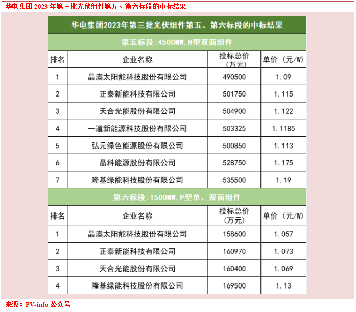 11月3日,华电集团公布了2023年第三批光伏组件第五、第六标段的中标结果,0.9933元/W的低价光伏组件并未中标,但从中标单价来看,以最低的中标价格为晶澳的1.057元/瓦排名第一。