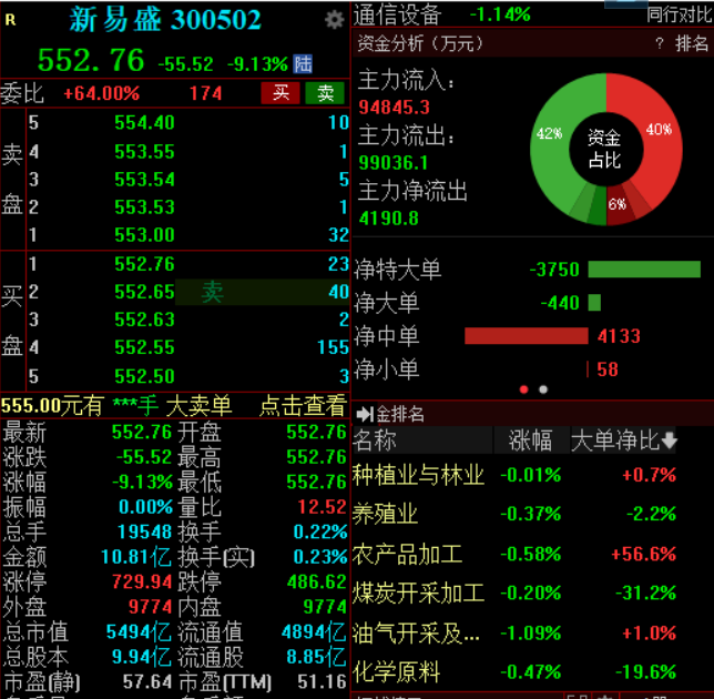 新易盛低开超9%,消息面上,2026年一季报显示,新易盛实现营收约83.38亿元,同比增长105.76%;归母净利润约27.80亿元,同比增长76.80%。