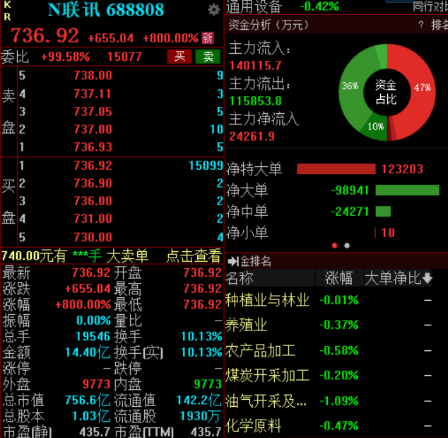 个股方面,新股N联讯上市首日高开800%,报736.92元。