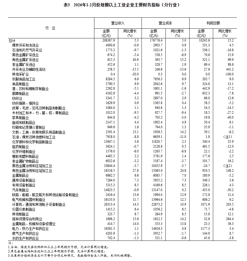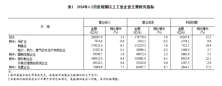 2026年1—2月份全国规模以上工业企业利润增长15.2%