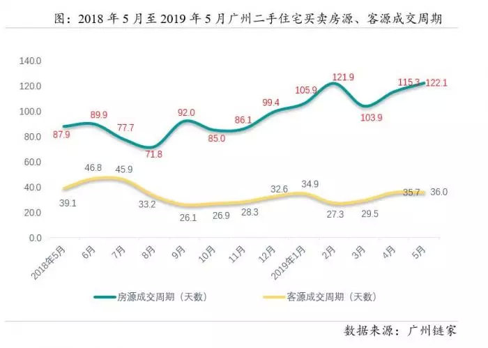 广州链家市场战略官周峰近日指出,广州二手房市场新增供给明显增加。5月前29天,经广州链家新收委托出售的有效房源逾6600套,是自2018年11月以来的高位,且多为大两房和三房物业。不过,供需对比没有太大变化,业主售房成交周期在本月放大至122天,与春节所在的2月持平。