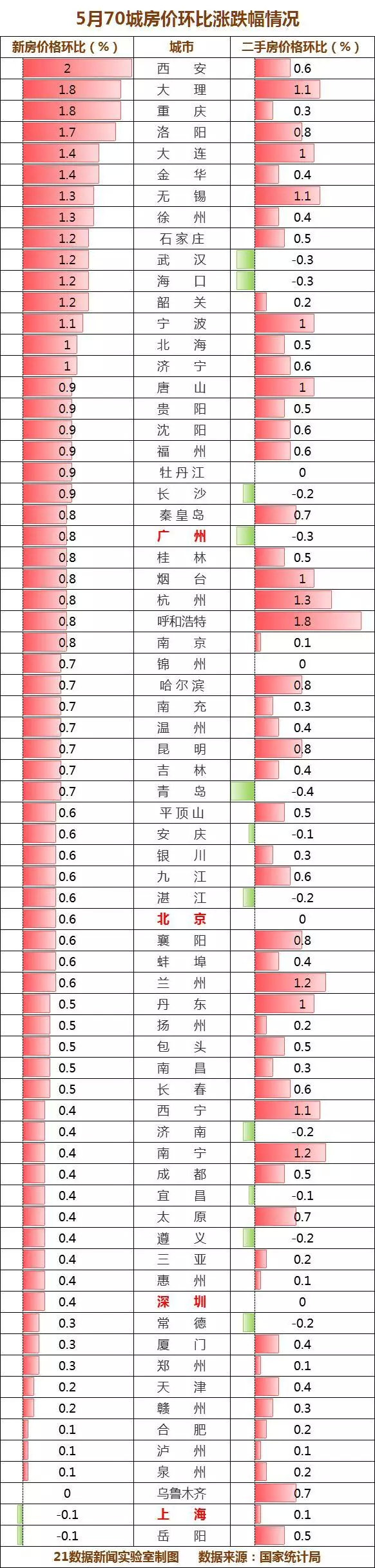 2019年5月70个大中城市新房、二手房价格涨跌幅(以新房价格涨幅排序):